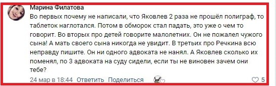 3. Относительного всей неправды про Ивана Речкина и количества адвокатов у лиц, имевших в разное время отношение к рассматриваемому уголовному делу. Во-первых, не вполне ясно, что именно из написанного в материале про Речкина является неправдой: хотелось бы внятного указания на утверждения, которые противоречат объективной действительности.